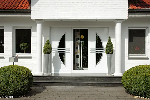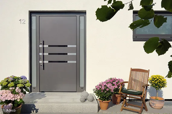 Die Haustür élégance ist eine sogenannte Einsatz-Füllungstür: In den Flügelrahmen wird ein Einsatz integriert, der eine breite Wahl möglicher Oberflächen zulässt. Der Typ élégance alu verfügt über eine äussere Alu-Verkleidung, was die freie Farbwahl von Füllung und Rahmen möglich macht.