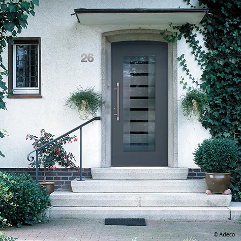 Die edle und repräsentative Eingangspartie: Die Haustür prestige überzeugt aussen durch eine fugenlose, versatzfreie Fläche zwischen Füllung und Flügelrahmen. Dies gewährleistet gestalterische Lösungen, die durch ihre repräsentative Eleganz brillieren.